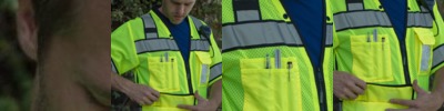 - Outside left chest patch pocket (Size small left chest pocket is on the inside of the vertical tape)
