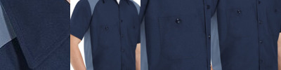 - Two button-thru, hex style pockets with angled bartacks, bartacked pencil stall on left pocket